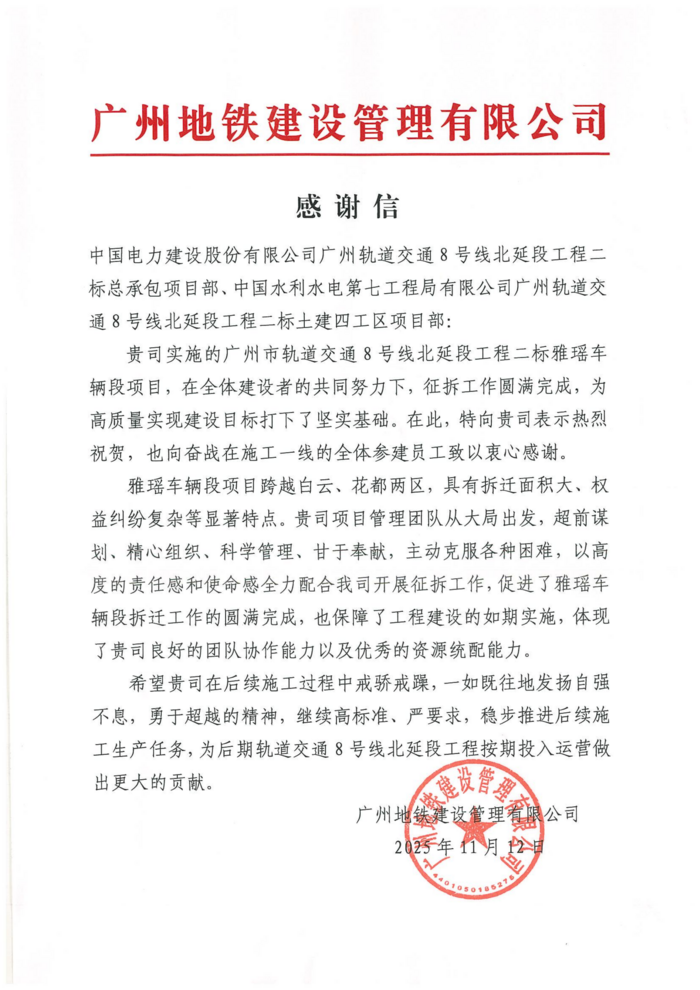 本网广州消息(曹爱宗 报道) 11月17日,水电七局广州轨道交通8号线北延段工程二标土建四工区收到业主感谢信,信上对雅瑶车辆段项目征拆工作圆满完成表示感谢。 信中指出,雅瑶车辆段项目跨越白云、花都两区,面临拆迁面积大、权益纠纷复杂等诸多挑战。在项目建设过程中,项目管理团队从大局出发,超前谋划、精心组织、科学管理、甘于奉献,主动克服各种困难,以高度的责任感和使命感全力配合开展征拆工作,最终促成雅瑶车辆段拆迁工作圆满完成,为工程建设如期实施筑牢根基,充分展现了出色的团队协作能力与优秀的资源统配能力。 下一步,项目部将继续发扬“自强不息、勇于超越”的企业精神,高标准、严要求稳步推进后续施工生产任务,为广州轨道交通8号线北延段工程按期投入运营贡献更大力量。(责任编辑 兰鸥) 感谢信 |