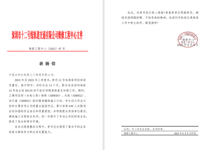 本网深圳消息(涂威 报道)9月9日,深圳地铁12号线工建维保项目收到业主表扬信。