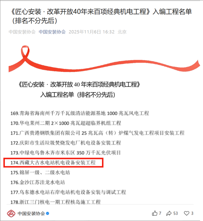 “西藏大古水电站机电设备安装工程”成功入选《匠心安装·改革开放40年来百项经典机电工程》 |